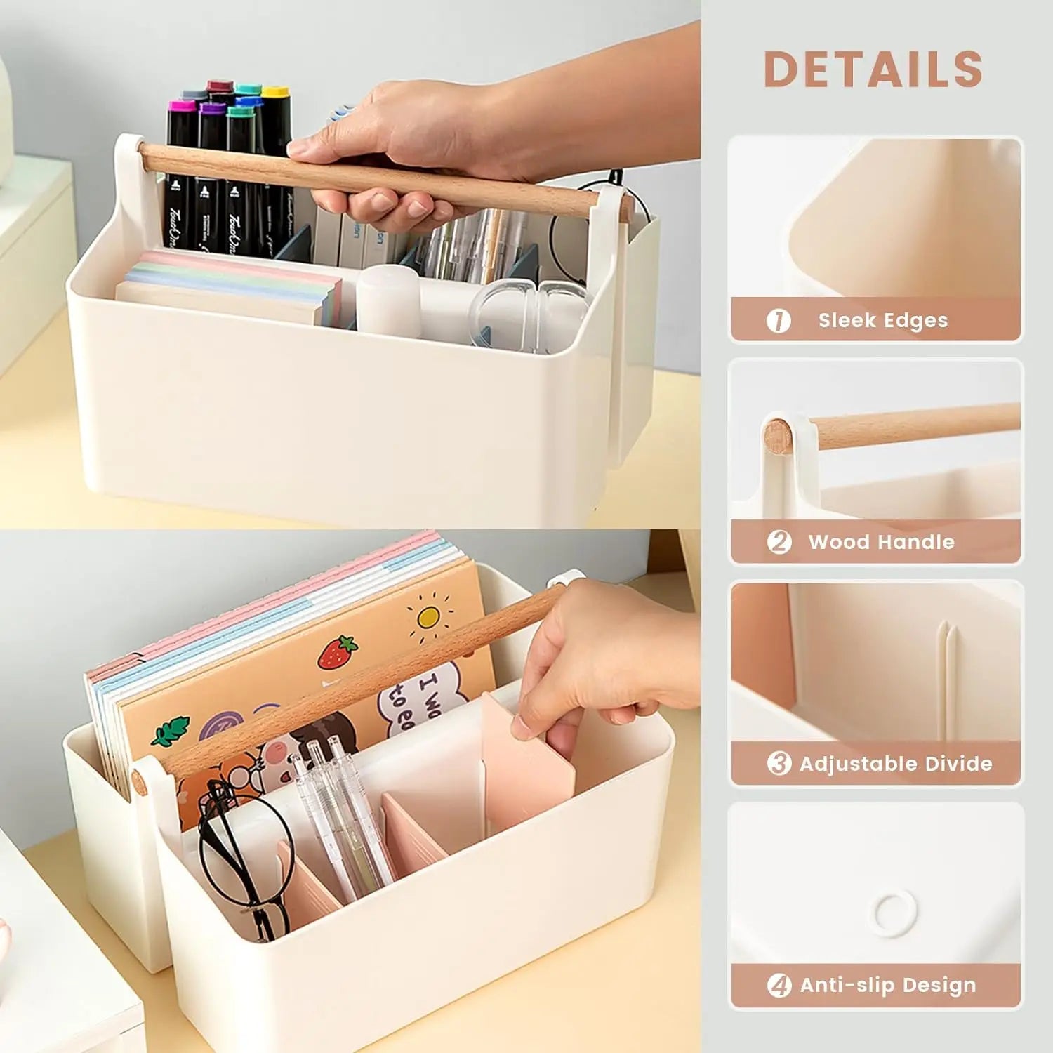 【Removable Dividers Craft Storage Caddy & Foldable Art Supply Bins】- The white art storage caddy features a unique design with both a wood handle and removable dividers. The carrying handle allows for easy transport of the box to different locations, while the removable dividers enable you to customize the storage space according to your needs. Also comes with 2 different size of art supply bins, they are foldable and easy for you to carry to anywhere you want.