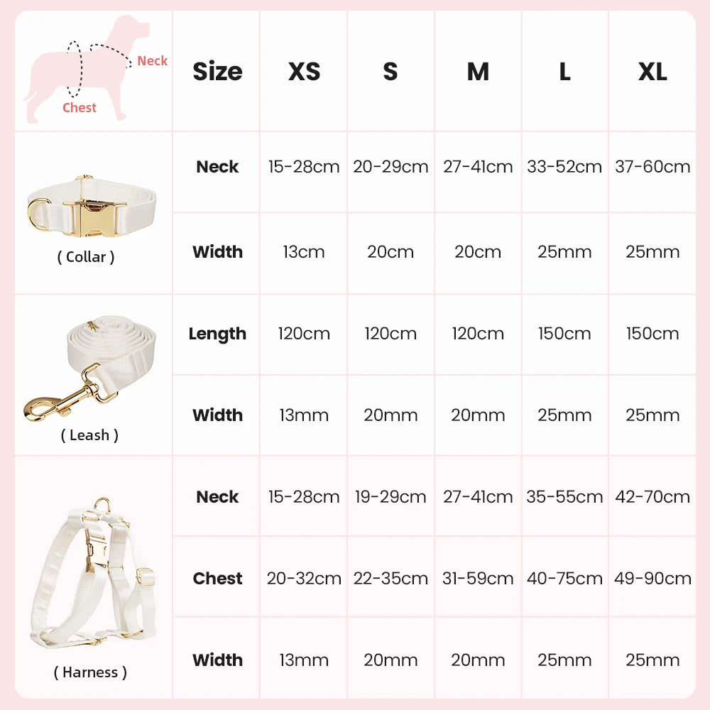 Available as a collar, leash, harness, or matching set. Mix and match to create the perfect outfit for your pet’s big day or everyday elegance.